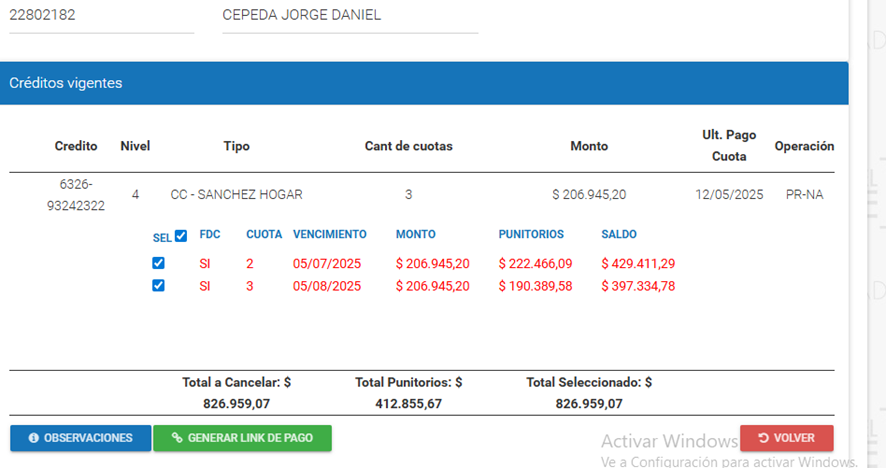 -Podemos seleccionar y hacer clic en el Crédito para poder desplegar y ver la cantidad de cuotas.