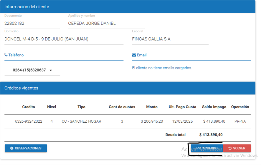 . Para saber si el titular puede refinanciar su deuda, la opción de “PR.ACUERDO“ debe de poder clicarse y estar en color azul.