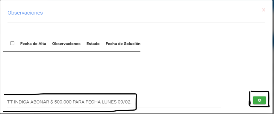 Se debe dejar registrado de manera resumida el compromiso de pago que realizara el cliente.Ej: