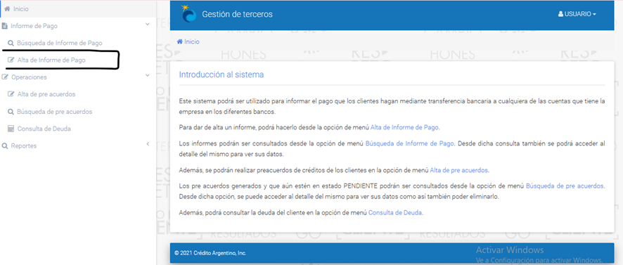 .Para realizar la carga de un comprobante de pago se debe volver a “ Inicio” donde están situadas todas las opciones del sistema de Crédito Argentino.