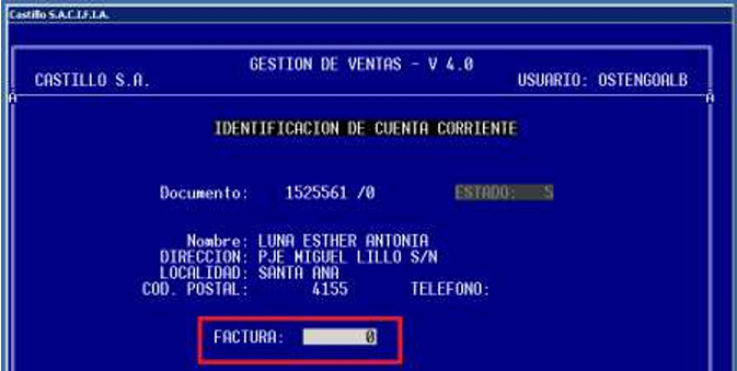 Si bien el SISTEMA tiene predeterminado la FACTURA 0 tenemos las opciones en las cuales se brinda la siguiente información. Una vez que elegimos la FACTURA presionamos ENTER.