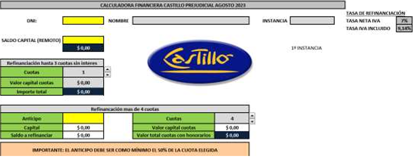 • Junto con el SISTEMA REMOTO de CASTILLO utilizamos una calculadora financiera en la que podemos visualizar el monto actualizado con honorarios y refinanciar la deuda. La CALCULADORA se actualiza mensualmente una vez recibida la asignación desde la empresa.