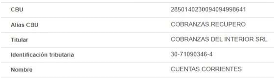 CBU: 2850140 2 3009409499864 -1 – Alias: COBRANZAS.RECUPERO