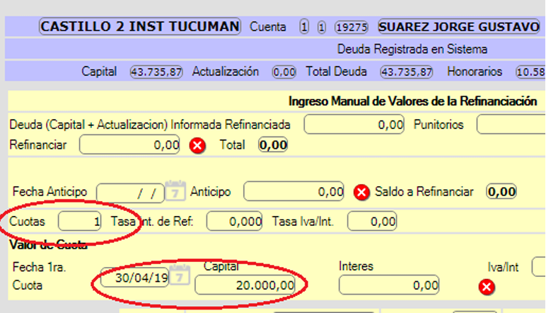 Si corresponde a una cancelación, lo ingresamos como CUOTA 1, la fecha del mismo con el ALMANAQUE