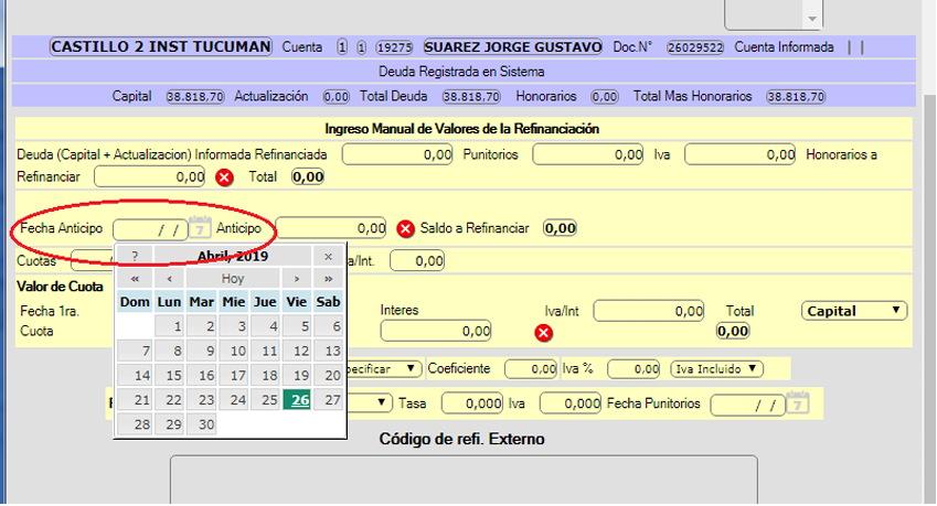 Si corresponde a una cuenta con anticipo, ingresamos la fecha del mismo con el ALMANAQUE