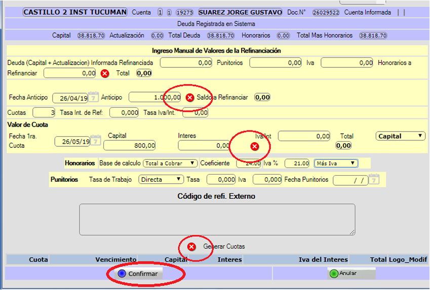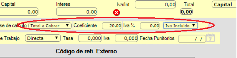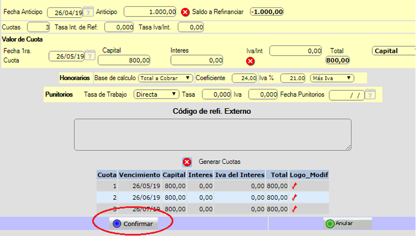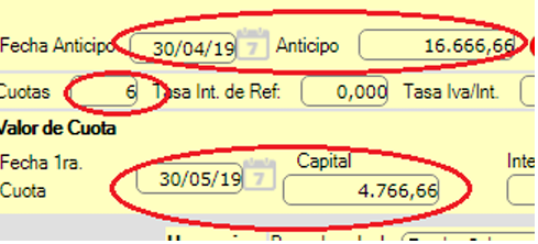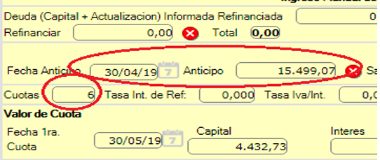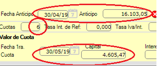 Ingresamos el anticipo capital + cuotas si corresponde + fecha de cuotas (utilizando almanaque) + base de cálculo (TOTAL A COBRAR) + coeficiente según corresponda la cartera o mora + IVA % (si corresponde) + IVA incluido o más IVA (según corresponda)
