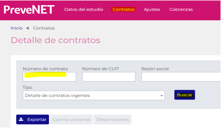 Una vez dentro iré a contratos y pegare el contrato de mi cuenta, en caso de tener solo el CUIT abro la asignación y busco el contrato