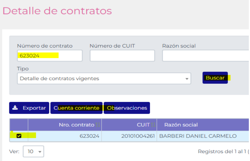 Luego de colocar el contrato presionare en BUSCAR, tildare la cuenta y selecciono CUENTA CORRIENTE