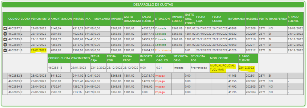 Ver: se abre un pop-up con el detalle de la cuenta corriente del cliente para poder ver la cantidad de cuotas pagas, como se aplicaron los pagos y el medio de pago.