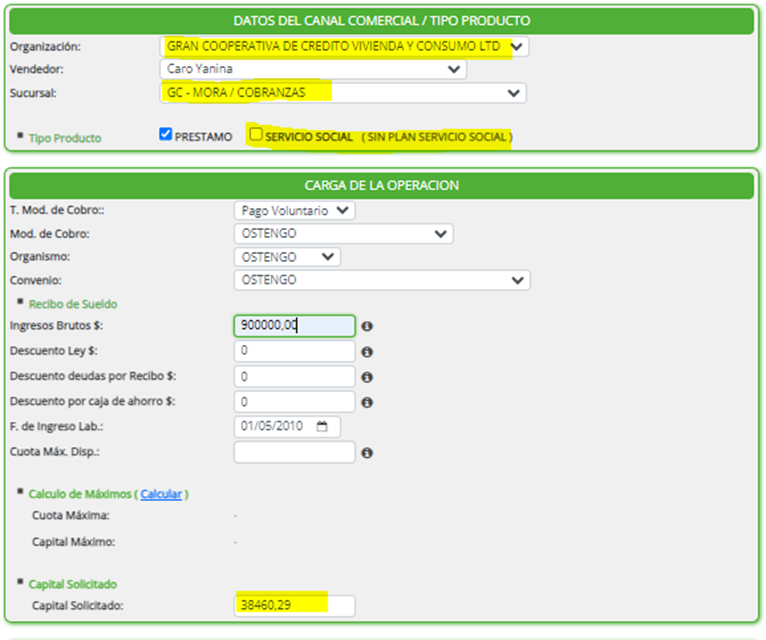 Una vez ingresados los datos, se verifican: y se seleccionan los datos del canal, es importante DESTILDAR la cuota de servicio social para que nos permita avanzar en las pantallas siguientes, asi como tambien VERIFICAR que el importe de capital solicitado sea el mismo que el valor del saldo que acordamos con el cliente para la refinanciación.