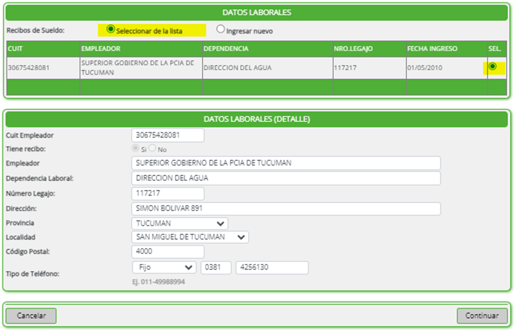 Se presiona continuar y se avanza con la carga para seleccionar los datos laborales: